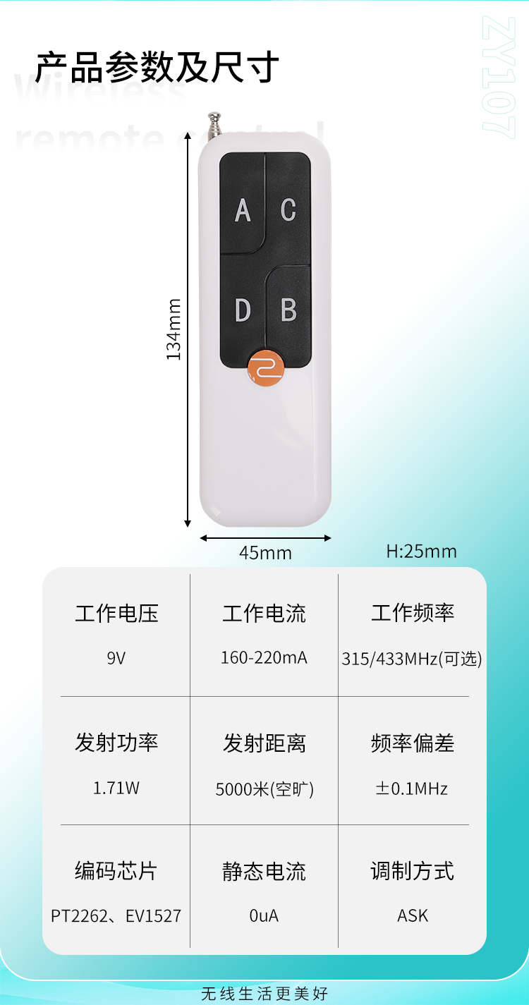 ZY107是一款大功率黄瓜视频污污污遥控器,具有可靠性高、频率稳定、穿透能力强、远距离等特点;