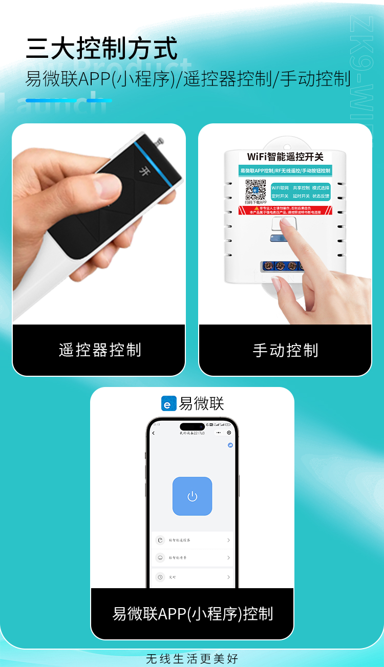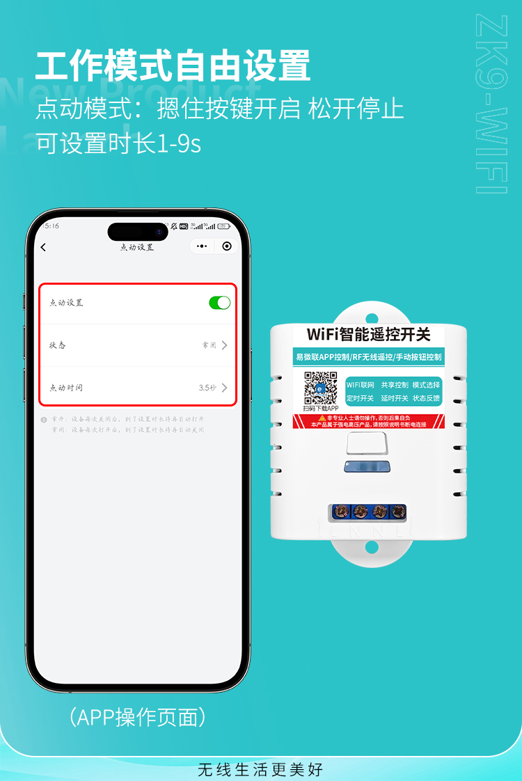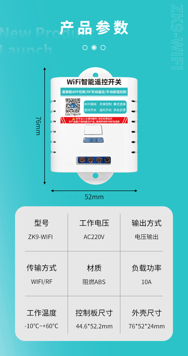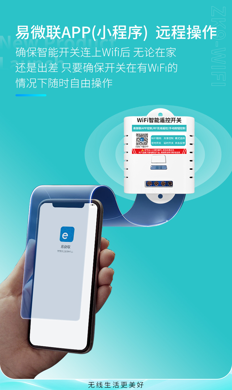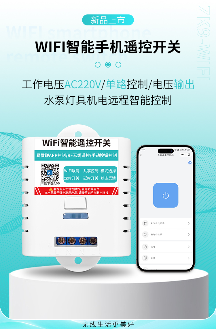 ZK9-WIFI是一款单路智能遥控开关,可使用手机遥控,电压输出