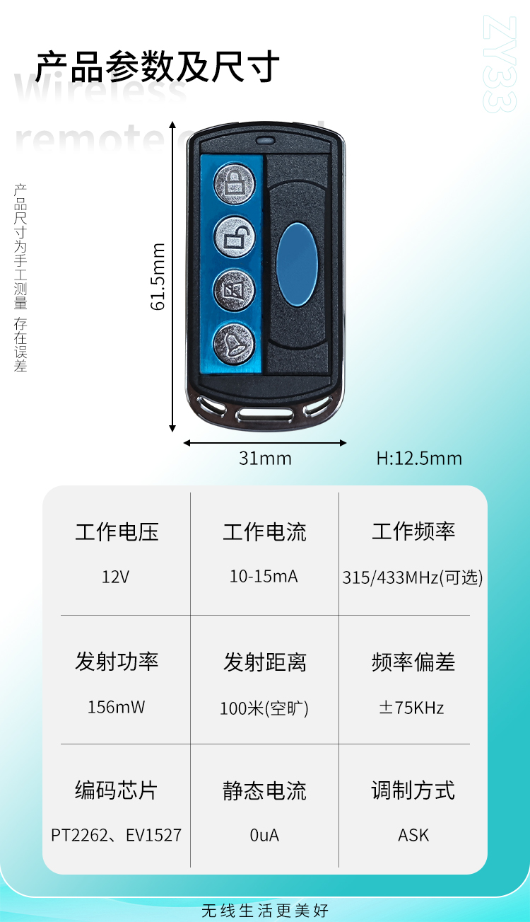 ZY33-5是一款具有5个触发按键的黄瓜视频污污污遥控器,一般黄瓜视频旧版破解版黄污于黄瓜视频污污污电设备的遥控;防盗系统、工业或家庭遥控控制等。