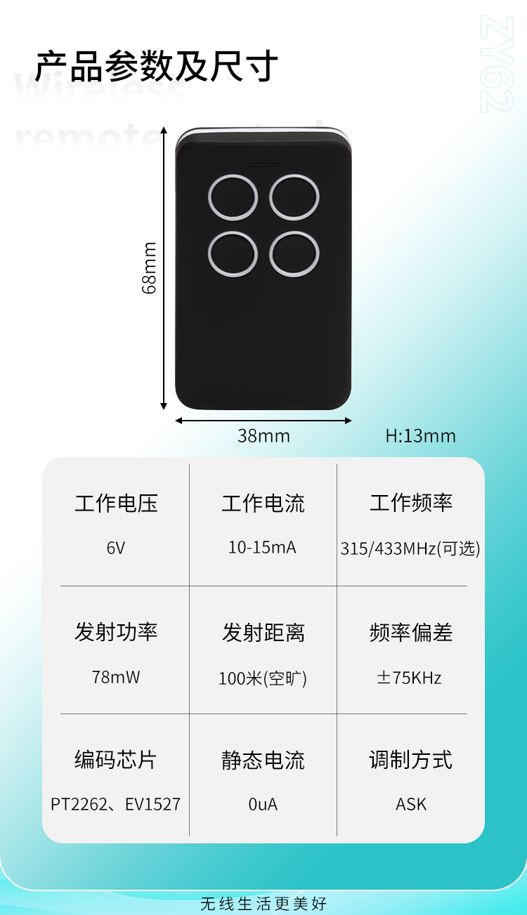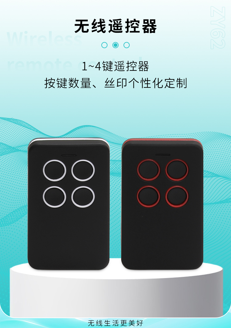ZY62-4是一款具有4个触发按键的黄瓜视频污污污遥控器,可以跟本公司的接收模块或控制器配套使用;也可以单独为客户黄瓜视频旧版破解版黄污,一般黄瓜视频旧版破解版黄污于黄瓜视频污污污电设备的遥控;如节能灯光、家庭防盗系统、工业或家庭遥控控制等。ZY62-4黄瓜视频污污污遥控器,具有可靠性高、频率稳定、穿透能力强等特点;其内部电路设计采用声表面谐振器稳频,全部采用SMD工艺,频率315MHZ或433MHZ可选,编码芯片采用EV1527,供电电源采用内置CR2016两节共6V电池供电。
