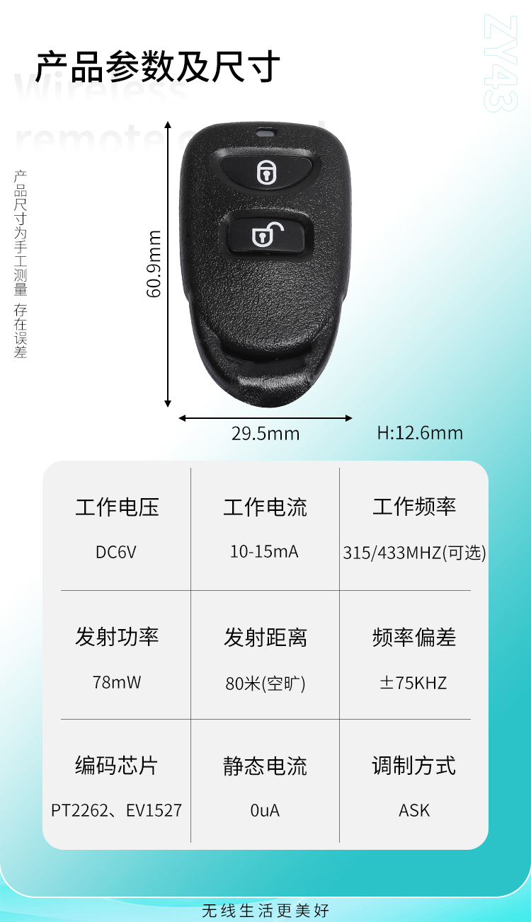 ZY43是一款小功率黄瓜视频污污污遥控器,具有可靠性高、频率稳定、穿透能力强等特点;