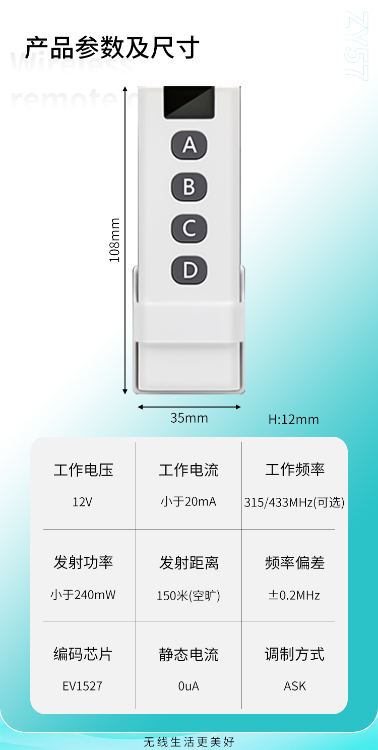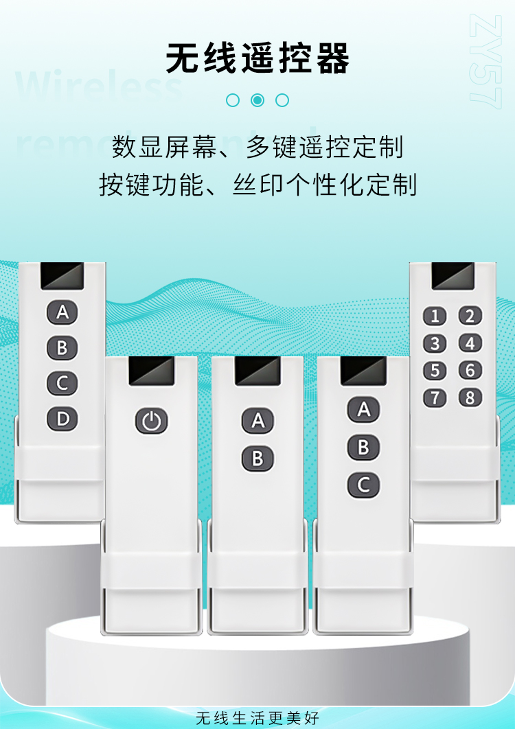 ZY57是一款带有指示灯的遥控器,多种按键可选择,具有可靠性高、频率稳定、穿透能力强等特点;