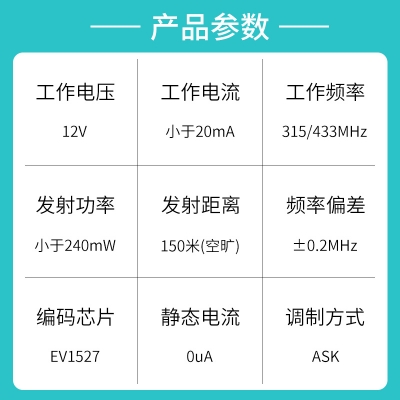 遥控车库门、遥控电源开关、黄瓜视频污污污遥控车位锁、遥控门锁、遥控电动卷帘门窗、节能灯光、家庭防盗系统、工业或家庭遥控控制等。