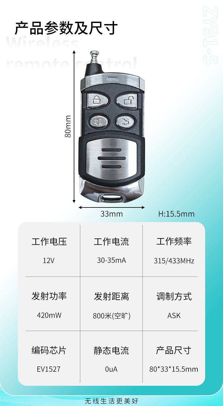 ZY91-5是一款中功率遥控器,体积小距离远,滑盖设计,5键遥控器