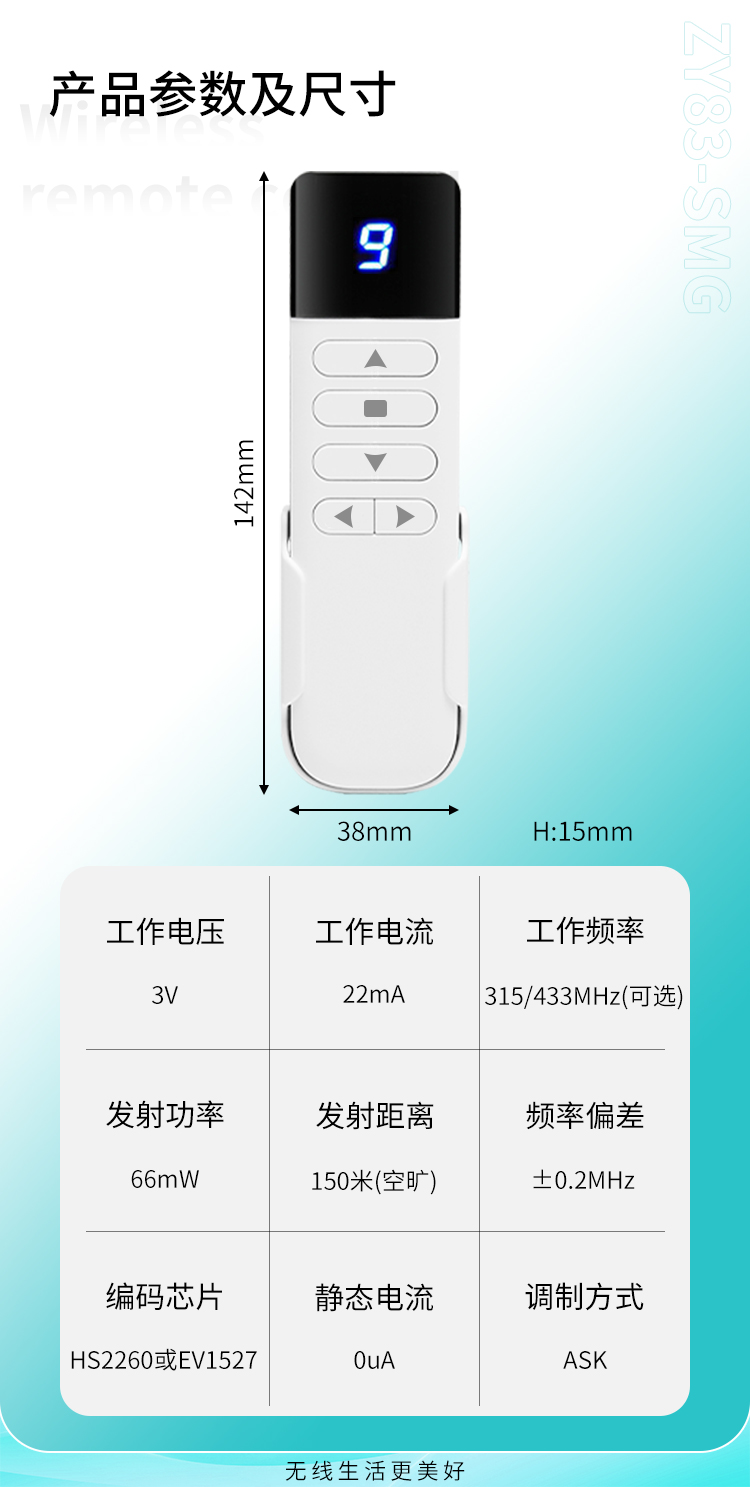 ZY83-SMG是一款带有数显屏的遥控器,外观精美,多种按键可选择,带有底座,具有可靠性高、频率稳定、穿透能力强等特点;